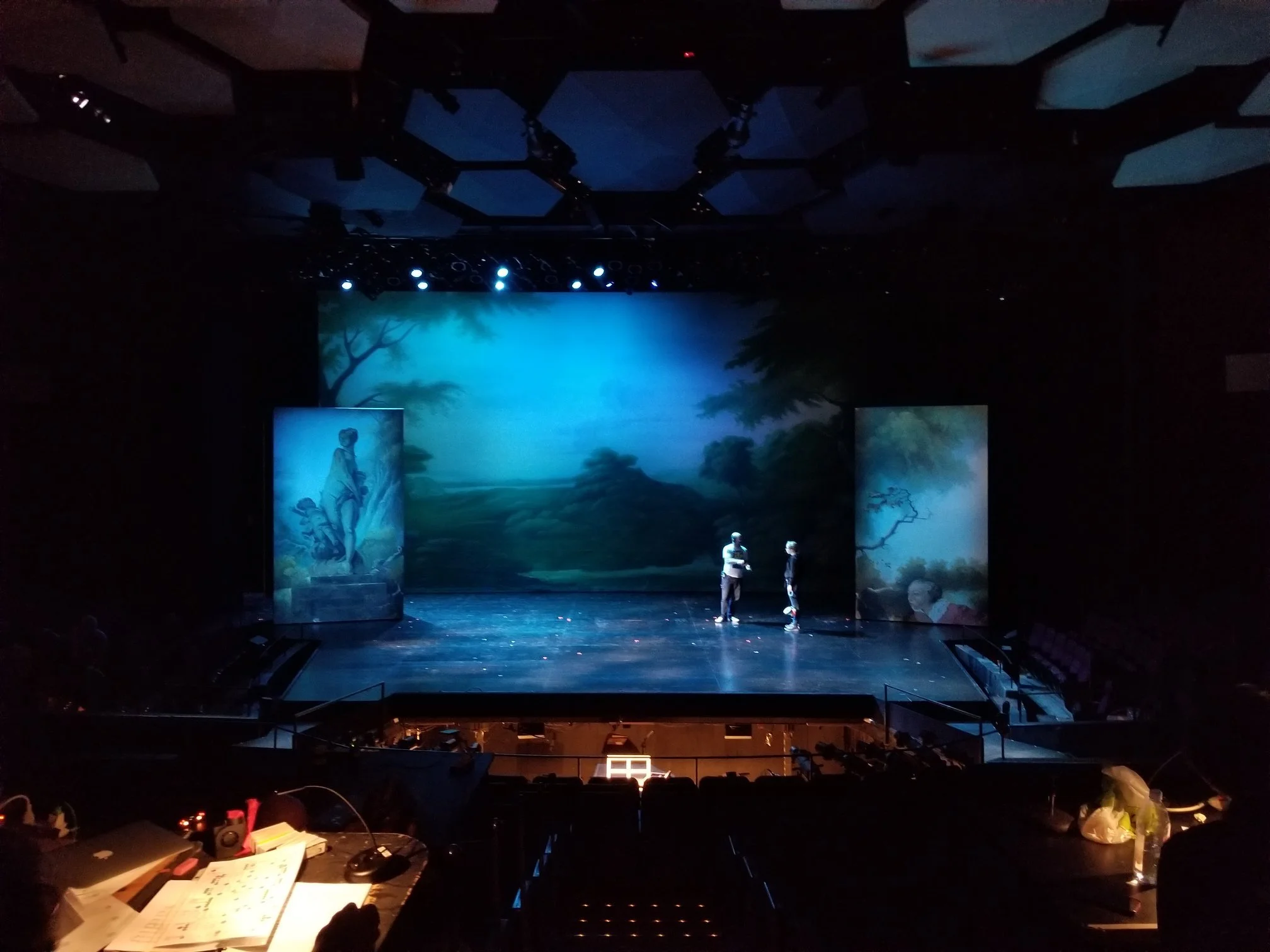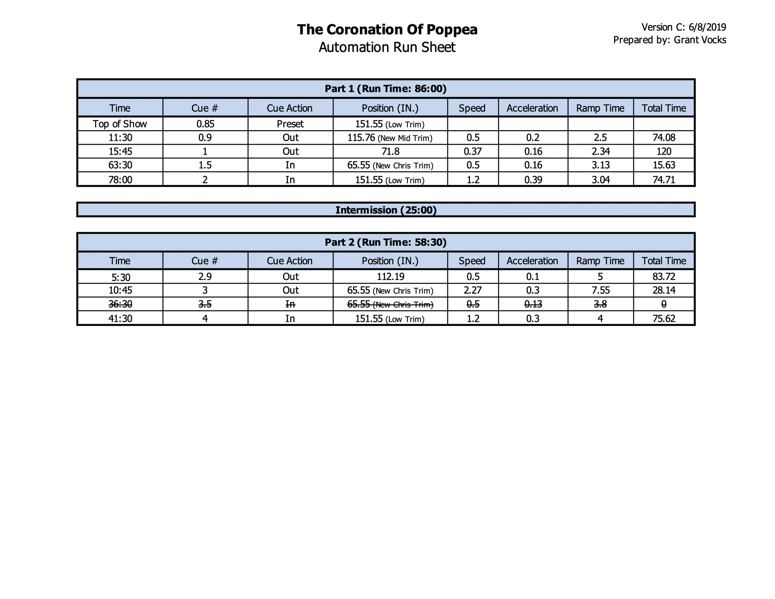 Production photo from The Coronation of Poppea and the automation paperwork that I prepared for the opera.