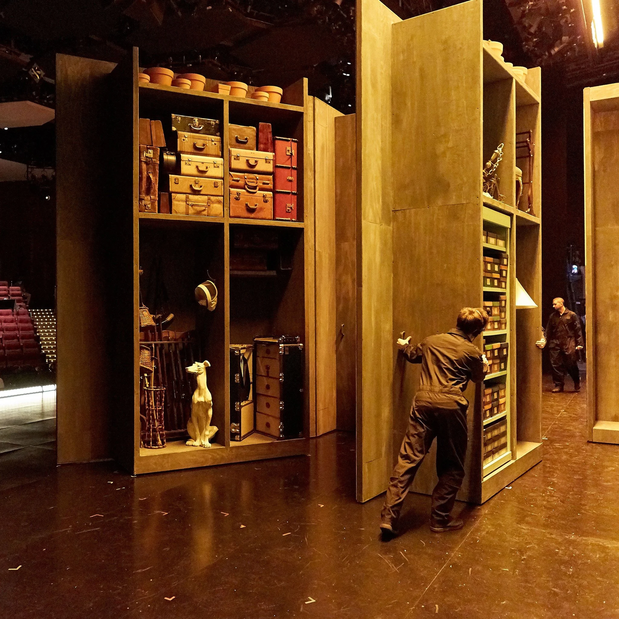 Photos from The Marriage of Figaro: The set consisted of seven of these large rolling flat units. One side was a painted flat and the other side had shelves for set dressing.